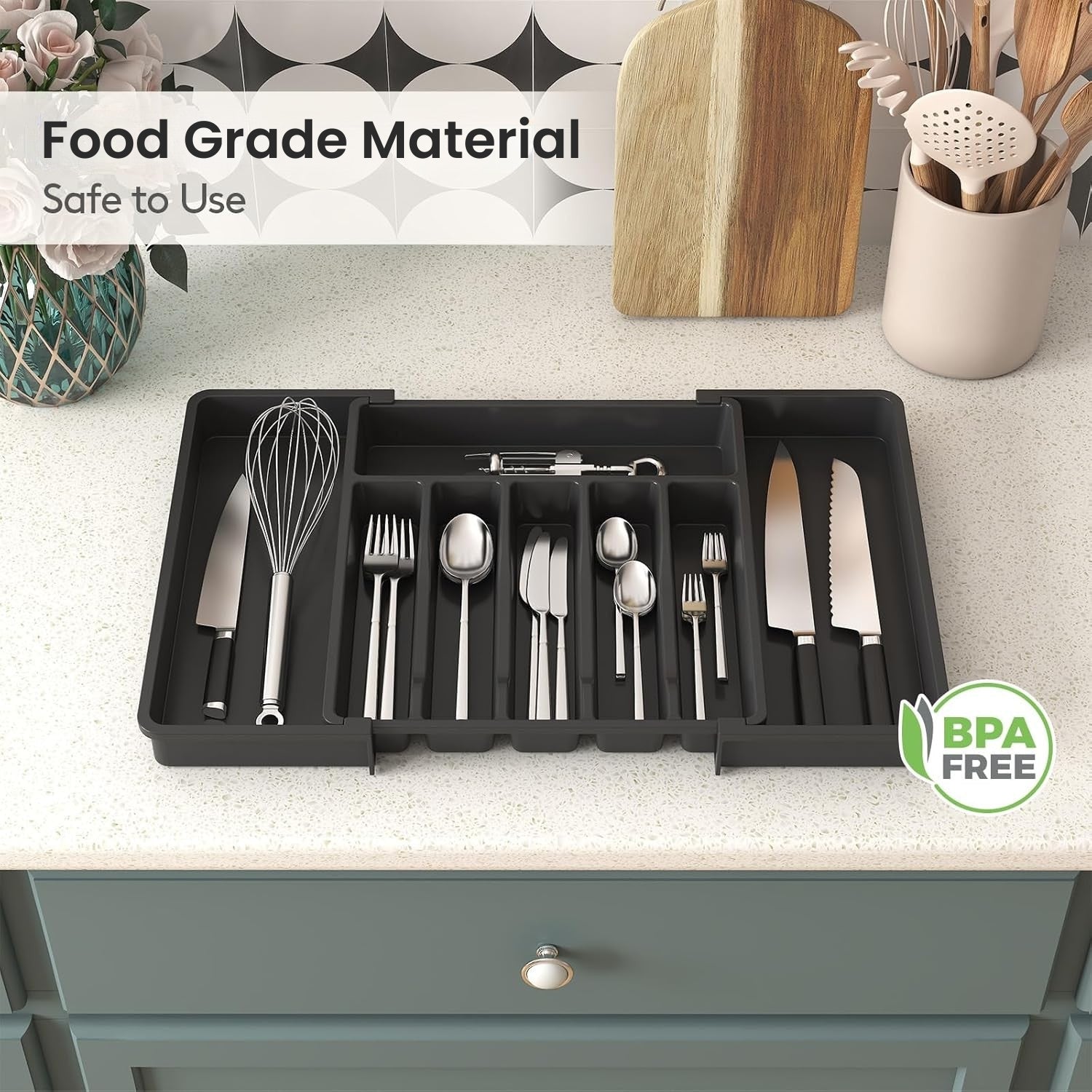 Declutter your kitchen drawers with the Expandable Silverware Drawer Organizer, designed for ultimate convenience and a sleek, organized look.